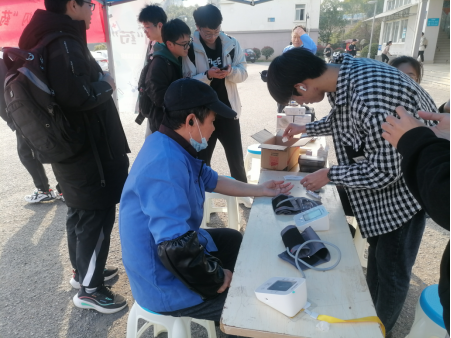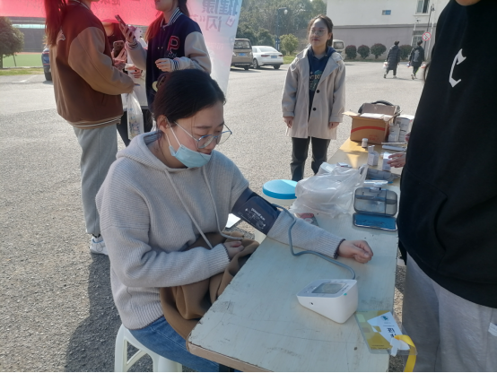 本次公益体检现场,同学们在受过培训的工作人员的带领下,依次测量体重、血压与血糖。