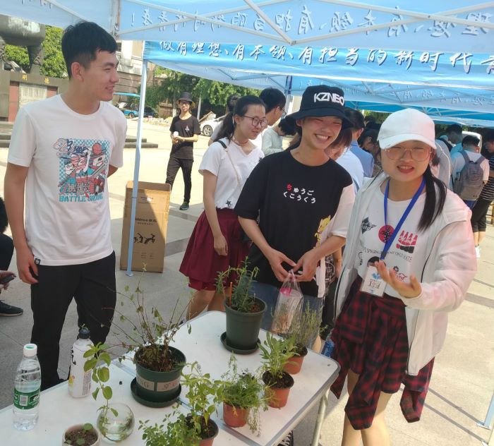 本次活动中,参加“走进身边的中草药”精品课程的同学,在活动当天把自己小组内培养的鱼腥草、甜菊、鼠尾草、百里香等中草药苗带到了现场,并且利用自己平时种植中草药苗观察得到的知识对前来参观的同学进行科普,通过介绍中草药出芽、长叶、开花、结果不同阶段的培育过程,加深同学们对中医药文化的理解。