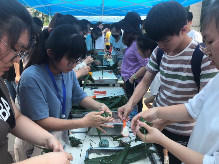 活动现场,工作人员早已将糯米、蜜枣、粽叶、绳子等包粽子材料准备就绪,大家在高手的指导下认真学习如何包粽子,卷粽叶、放米、捆扎,整个活动现场充满欢声笑语,其乐融融。活动还吸引了小朋友和外国留学生,他们在工作人员的指导下,饶有兴致的学习包粽子,体验了端午的民俗,近距离感受到了中国历史悠久的传统文化。